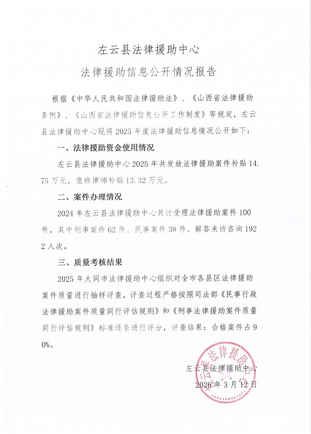 左云縣法律援助中心法律援助信息公開情況報告