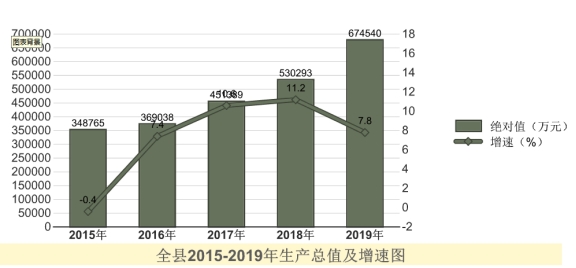 全年全縣地區生產總值674540萬元,比上年增長7.8%。其中,第一產業增加值29498 萬元,增長9.5 %,占生產總值的比重為4.4%;第二產業增加值257960 萬元,增長7.9 %,占生產總值的比重為38.2%;第三產業增加值387083 萬元,增長7.6 %,占生產總值的比重為57.4%。人均地區生產總值41361元。