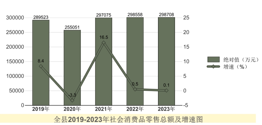 全年全縣社會消費品零售總額完成29.87億元,同比增長0.1%。按經營地統計,城鎮消費品零售額18.05億元,同比下降0.8%;鄉村消費品零售額11.82億元,同比增長1.4%。按消費形態統計,餐飲收入1.78億元,同比增長4.2%;商品零售28.09億元,同比下降0.2%。