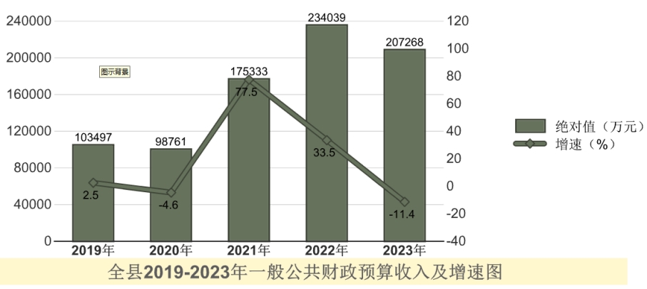 全年全縣一般公共預算收入完成20.73億元,同比下降11.4%。其中:增值稅完成5.96億元,企業所得稅完成3.11億元,資源稅完成4.71億元,城市維護建設稅完成0.46億元,其他稅收完成1.95億元。非稅收入累計完成4.54億元。一般公共預算支出完成27.13億元,同比下降1.8%。其中:一般公共服務支出4.18億元,教育支出2.98億元,社會保障和就業支出3.97億元,衛生健康支出1.59億元,農林水支出3.31億元,住房保障支出2.27億元。