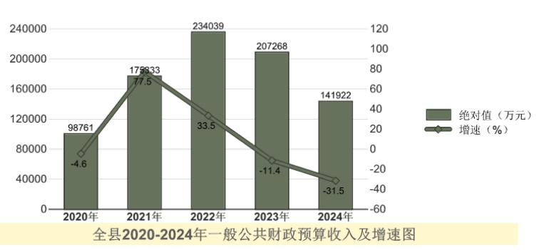 全年全縣一般公共預算收入完成14.19億元,同比下降31.5%。其中:增值稅完成3.75億元,資源稅完成3.71億元,企業所得稅完成2.29億元。非稅收入累計完成2.12億元。一般公共預算支出完成26.95億元,同比下降0.67%。其中:一般公共服務支出3.93億元,教育支出2.27億元,社會保障和就業支出5.67億元,衛生健康支出1.3億元,城鄉社區支出4.76億元,農林水支出3.43億元,交通運輸支出1.2億元,住房保障支出1.1億元。