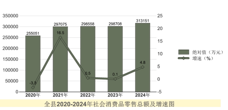 全年全縣社會消費品零售總額31.32億元,同比增長4.8%。按經營地統計,城鎮消費品零售額18.67億元,同比增長3.4%;鄉村消費品零售額12.64億元,同比增長7.0%。按消費形態統計,餐飲收入1.9億元,同比增長8.7%;商品零售29.38億元,同比增長4.6%。